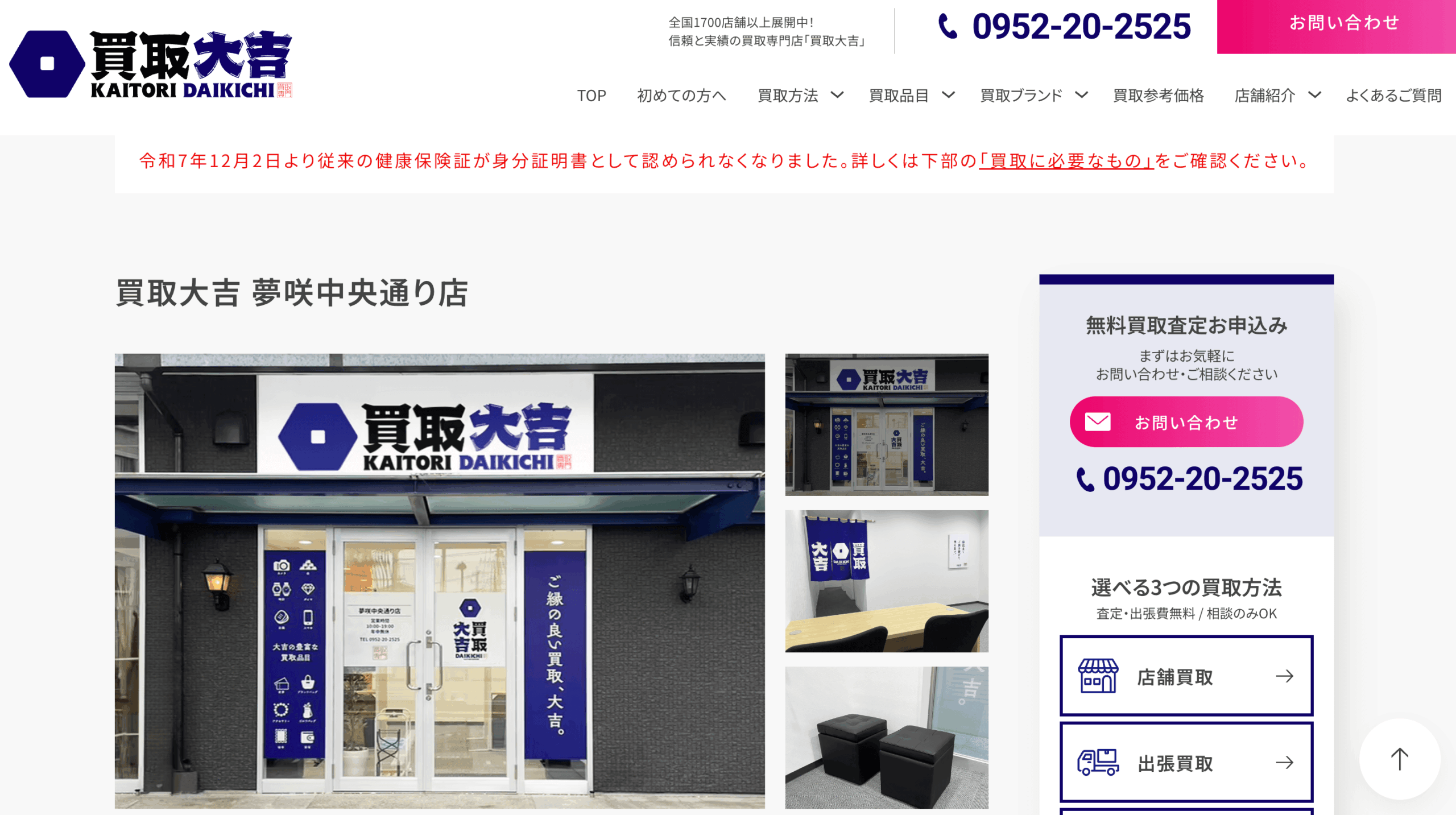 買取大吉夢咲中央通り店は、青い看板が目印の清潔感あふれる店舗で、査定員の親切丁寧な接客が口コミでも高く評価されています。
